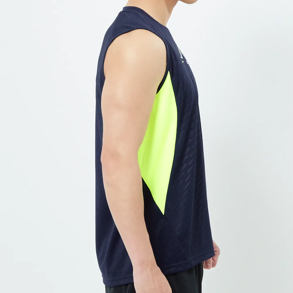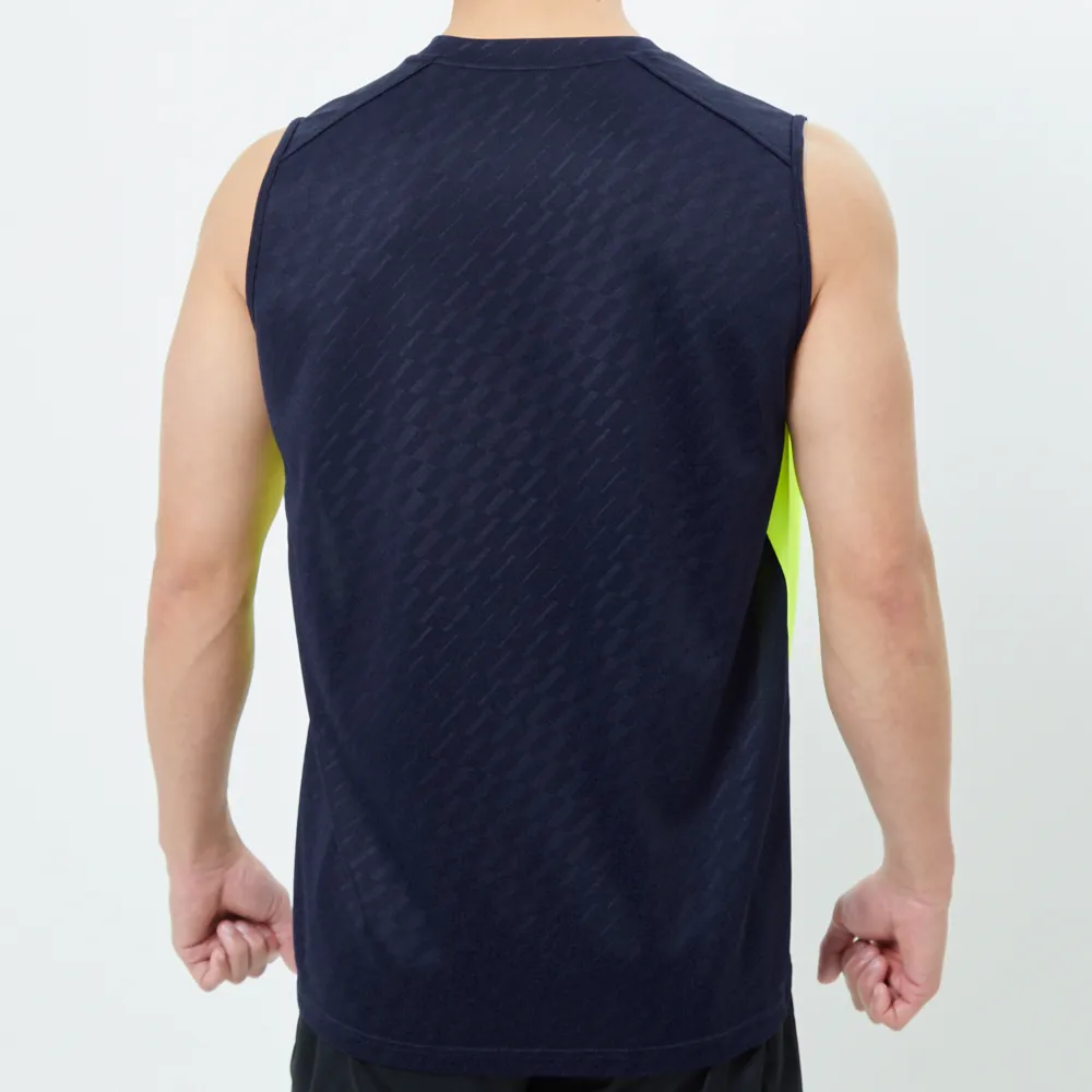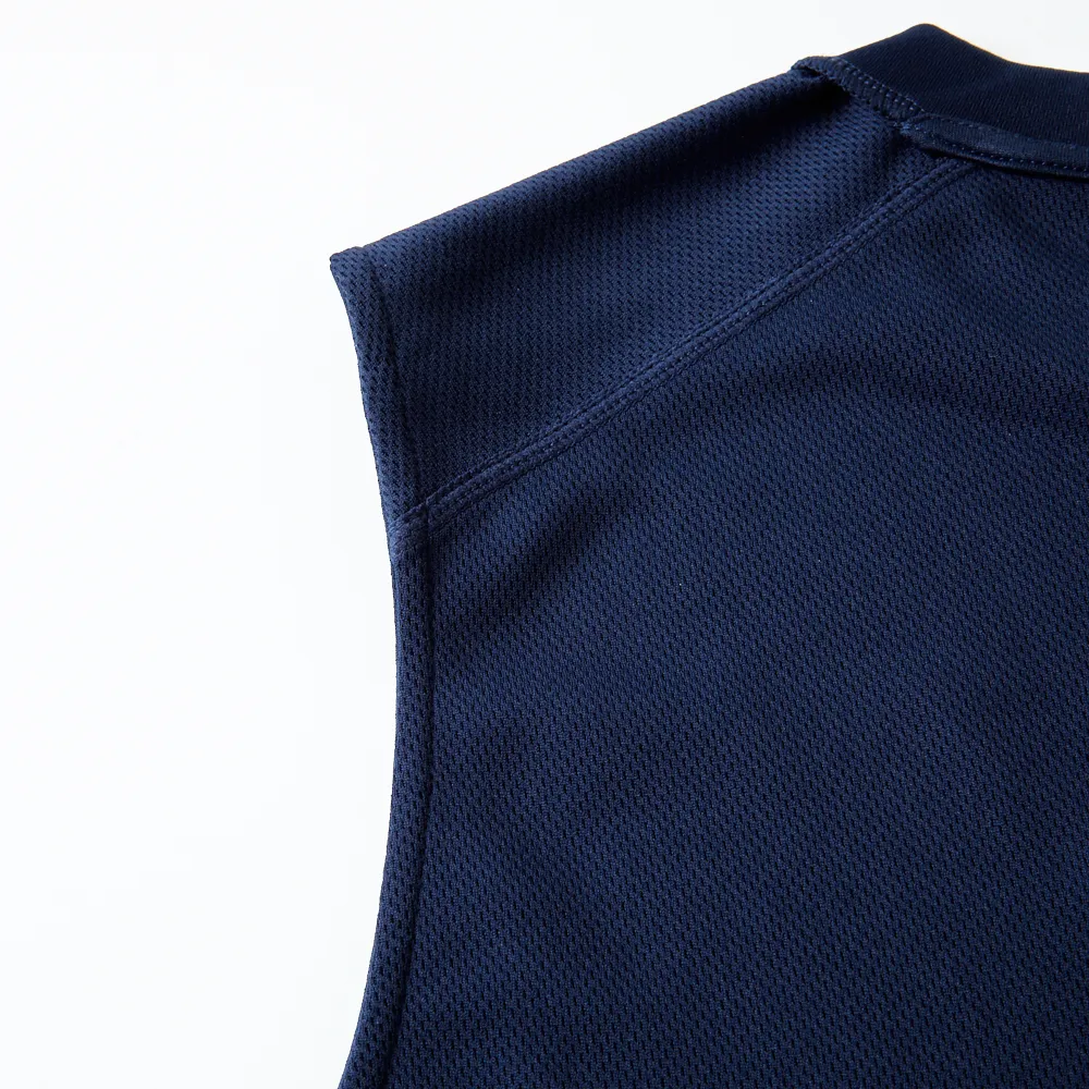 UVカット、吸汗速乾、透け軽減の機能素材 紫外線遮蔽率98% UPF50+ エンボス加工でおうとつと光沢感がありワンランク上質な風合い 猛暑対策のスリーブレステックシャツ 腕周りは肌擦れ軽減仕様